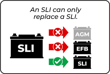 AGM is not interchangeable with EFB or standard flooded batteries. AGM can replace AGM, SLI and EFB. SLI and EFB should never replace AGM.