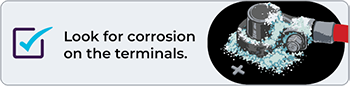 Check the battery terminals for a white or bluish powdery buildup. Corrosion can interfere with the connection and reduce performance.